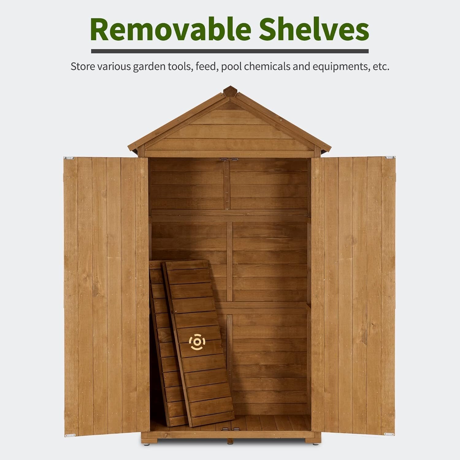 Includes two removable shelves that can be configured to create up to four storage sections, providing flexibility for tools, garden accessories, pool supplies, or household items.