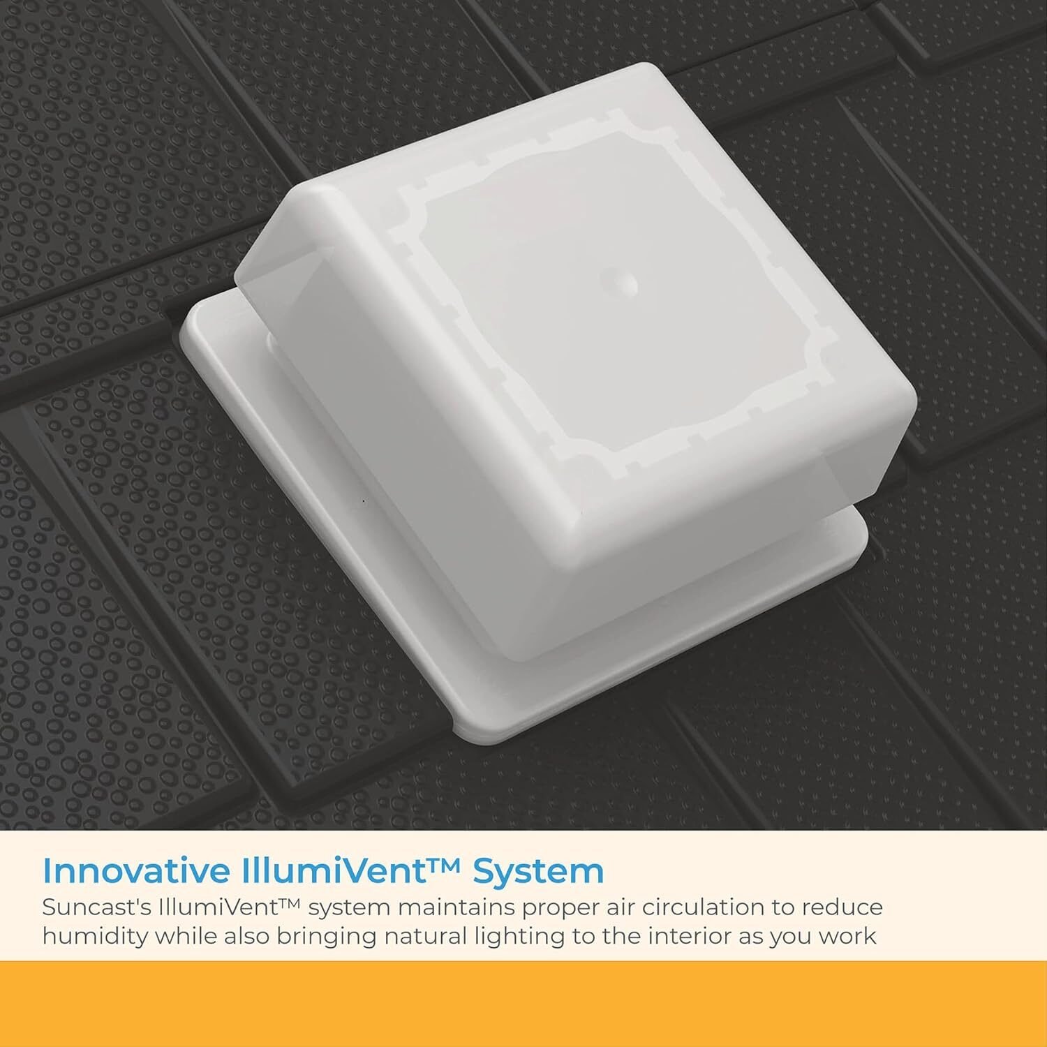 Features the Suncast IllumiVent system that promotes airflow and reduces humidity while allowing natural light to enter, keeping the interior dry and well-lit.