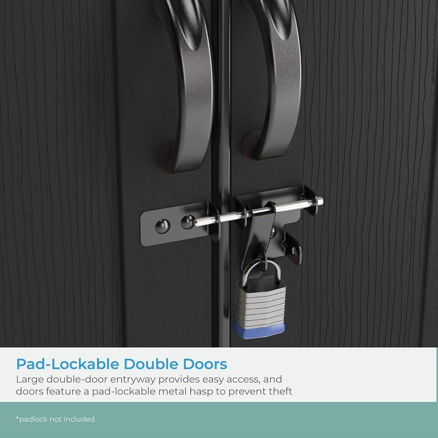 Wide double doors allow easy access and are fitted with a metal hasp for a padlock (padlock not included), keeping belongings secure and protected.